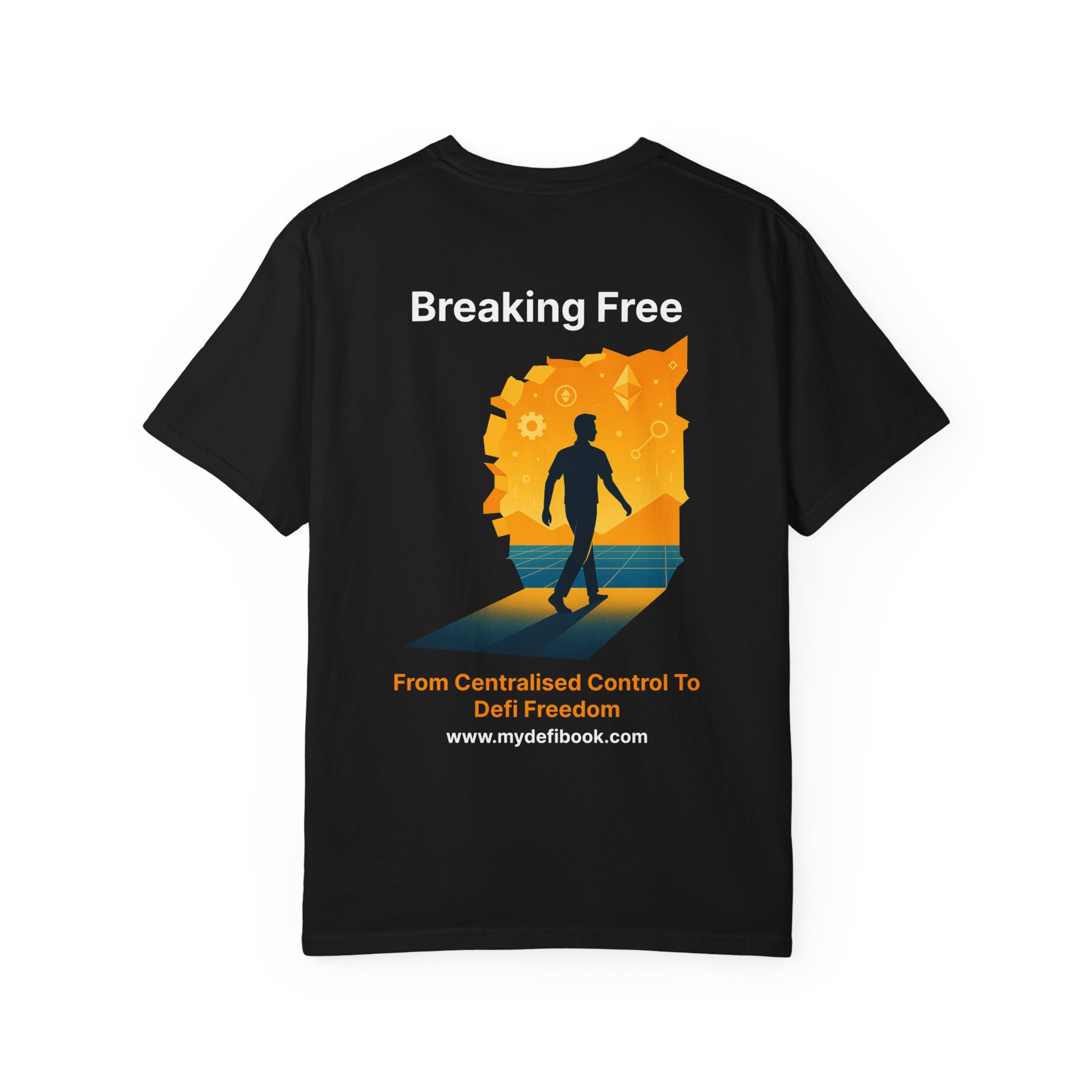 A heavyweight, garment-dyed tee that feels lived‑in from the first wear. The relaxed silhouette and soft, post‑construction dye create a broken‑in texture that drapes easily over jeans or layered under a jacket. On the back, a sunset-hued illustration shows a lone figure stepping toward an open horizon, framed by warm orange shapes and a teal shoreline; beneath it a subtle line of text reads “From Centralised Control To DeFi Freedom,” giving the shirt a quiet, rebellious message. A small matching badge on the chest keeps the design balanced and wearable every day. This shirt works for slow mornings at the café, weekend meetups with fellow builders, or heading out to a community event — it’s casual, thoughtful, and made to age beautifully with you.